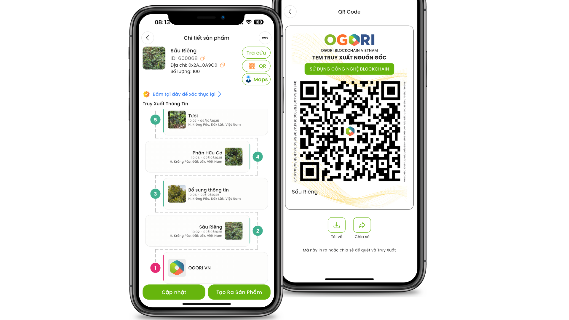 Ứng dụng OGORI giúp nông dân quản lý sản xuất minh bạch, tạo QR code truy xuất nguồn gốc và tăng giá trị thương hiệu với công nghệ Blockchain. Dữ liệu bảo mật, không thể chỉnh sửa.